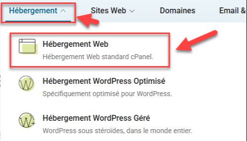 - Cliquez sur le bouton "Hébergements" et ensuite sur "Hébergement Web".