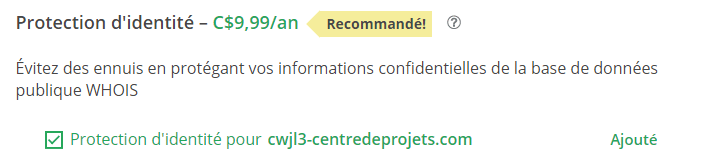- Vérifiez "Domain privacy" car bien qu'il soit gratuit sur un ".ca", il est possible que sur un ".com" vous aillez de frais d'environ 10$. Cela dit, nous vous recommandons tout autant de le prendre pour le ".com", cela va vous évitez de recevoir pleins de courriels SPAM aux adresses liées à ce nom de domaine.