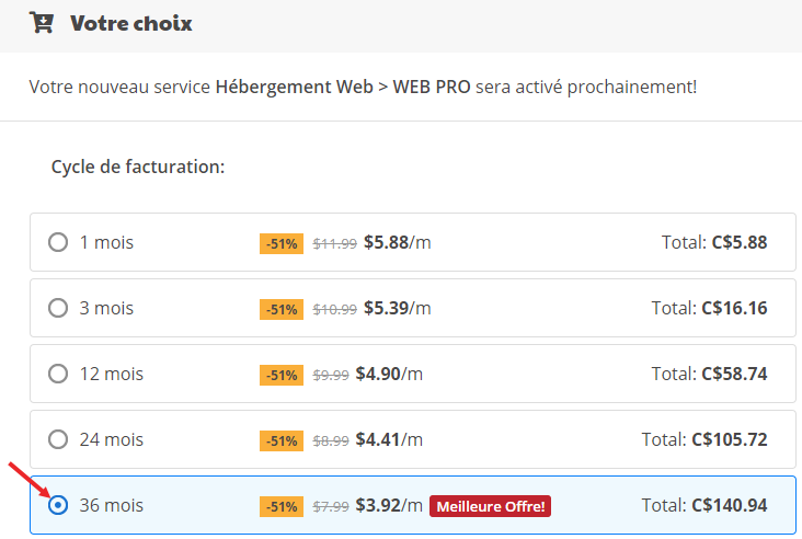 Pour profiter au maximum du rabais, la meilleure option est 36 mois. À partir du 37e mois, le renouvellement sera au prix régulier de 12,99$/mois.
